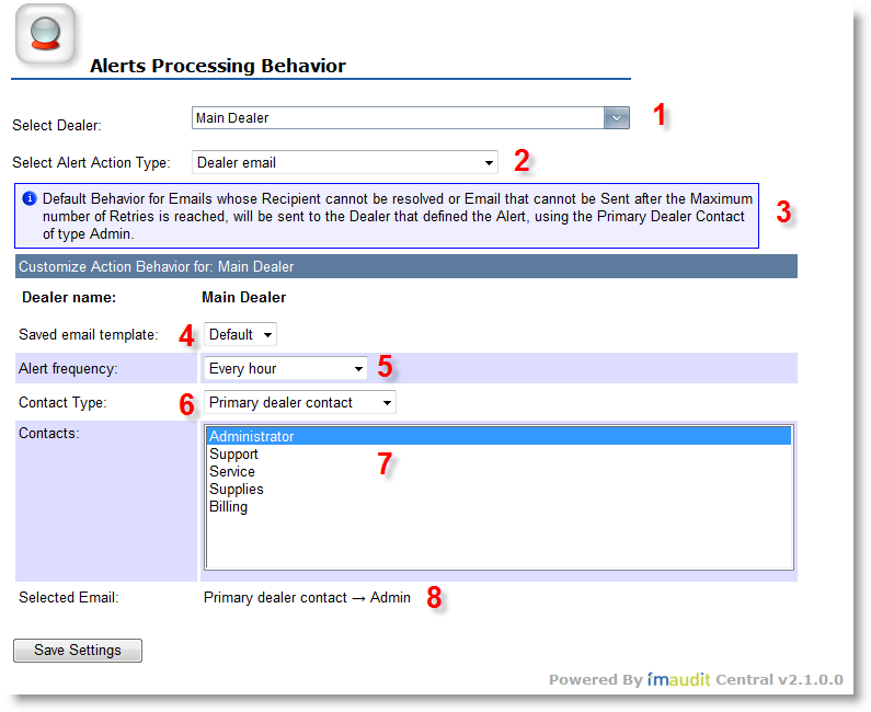 Using this page, you can configure all of the Alert Action types, but must first choose the action type from Section (2), then recipient from Sections (5), (6) and (7) before clicking on Save Settings. The settings for the selected action type will be saved and the user can continue the process for another Action Type.